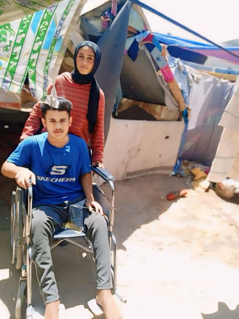 تدفع الطفلة الكرسي المتحرّك بشقيقها محمد وهي تدخل خيمة من القماش، يقيمون فيها في أحد مخيمات النزوح بمدينة دير البلح وسط قطاع غزة، وتروي: “كانت لنا حياة، كنا أنا وعائلتي 8 أفراد نعيش في بيت دافئ، ذكرياتنا جميلة، حُرمت منها باستشهاد أبي وأمي وإخوتي أحمد ومحمود وزينة ومريم، نجوت أنا وأخي محمد فقط”.