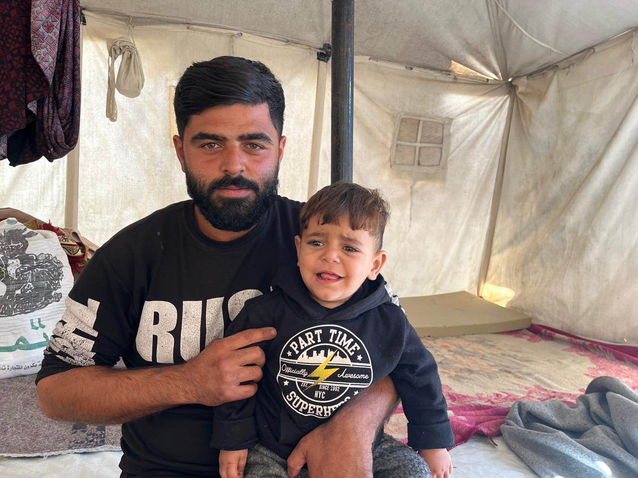 يُكافح محمود من أجل توفير لقمة العيش لطفله الأول الذي أبصر النور قبل الحرب بشهر، وكبر في مخيمات النزوح، فأصبحت متطلباته في ازدياد، وباتت حِملًا ثقيلًا على والده الذي يبحث دون كللٍ عن عملٍ لكن دون جدوى.
