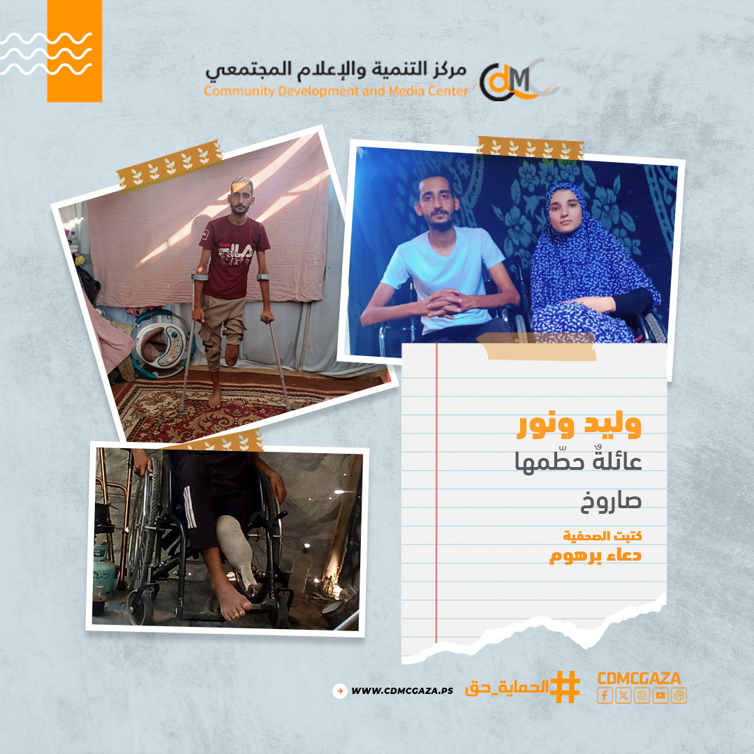 إلى جوار وليد، تجلس زوجته الشابة نور، والتي باتت ملازِمةً للكرسي المتحرّك، فهي أصيبت بكسرٍ في عمودها الفِقري، أدى إلى ثقبٍ في النخاع الشوكي، تسبب بشلل نصفي لها، تصف حالتها: “أصعب أيام حياتي حين فقدت أبي وإخوتي وأعمامي بعد استهداف منزلنا مرتين”.