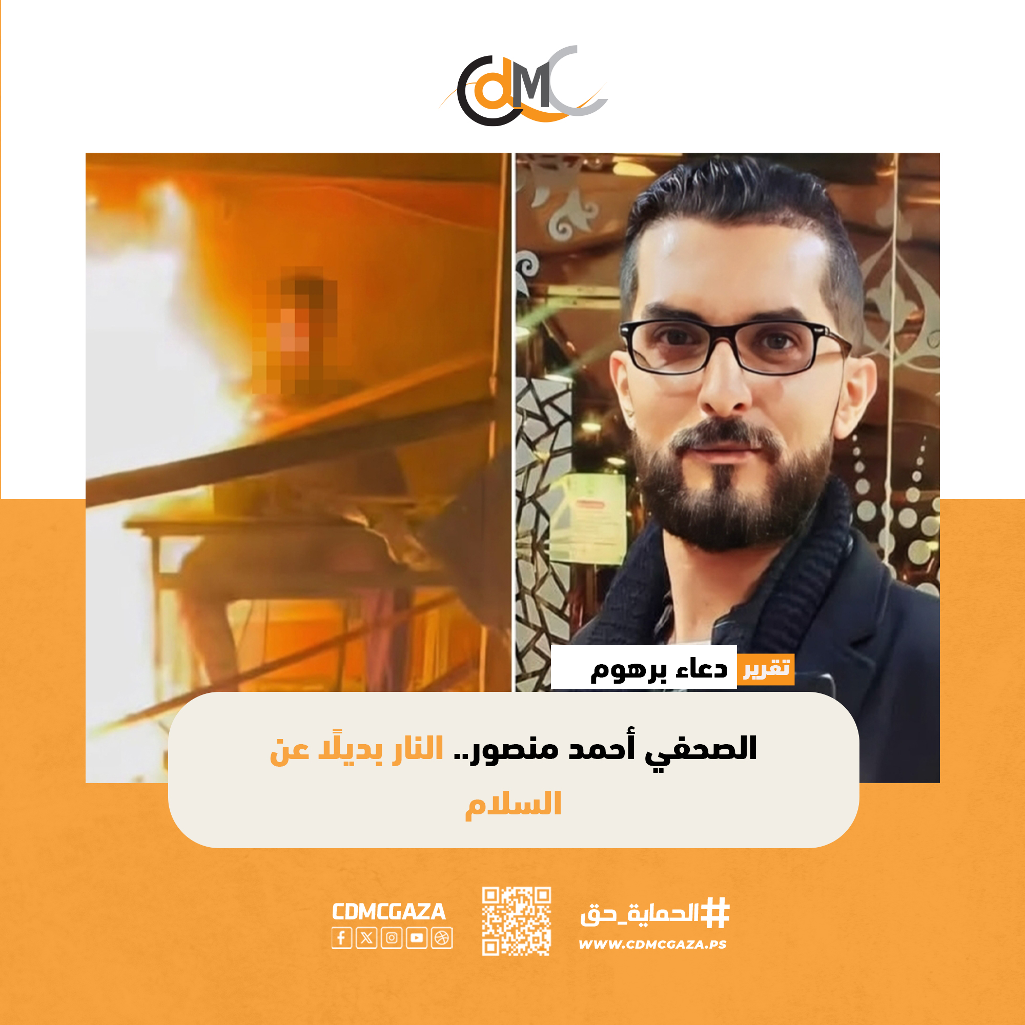 تطالب زوجة الصحفي أحمد منصور “35عاما” الذي يعمل محررًا في وكالة فلسطين اليوم، بتحقيق دولي في حادثة حرق زوجها، تختم: “لم يكن يحمل سلاحًا، بل قلمًا”.