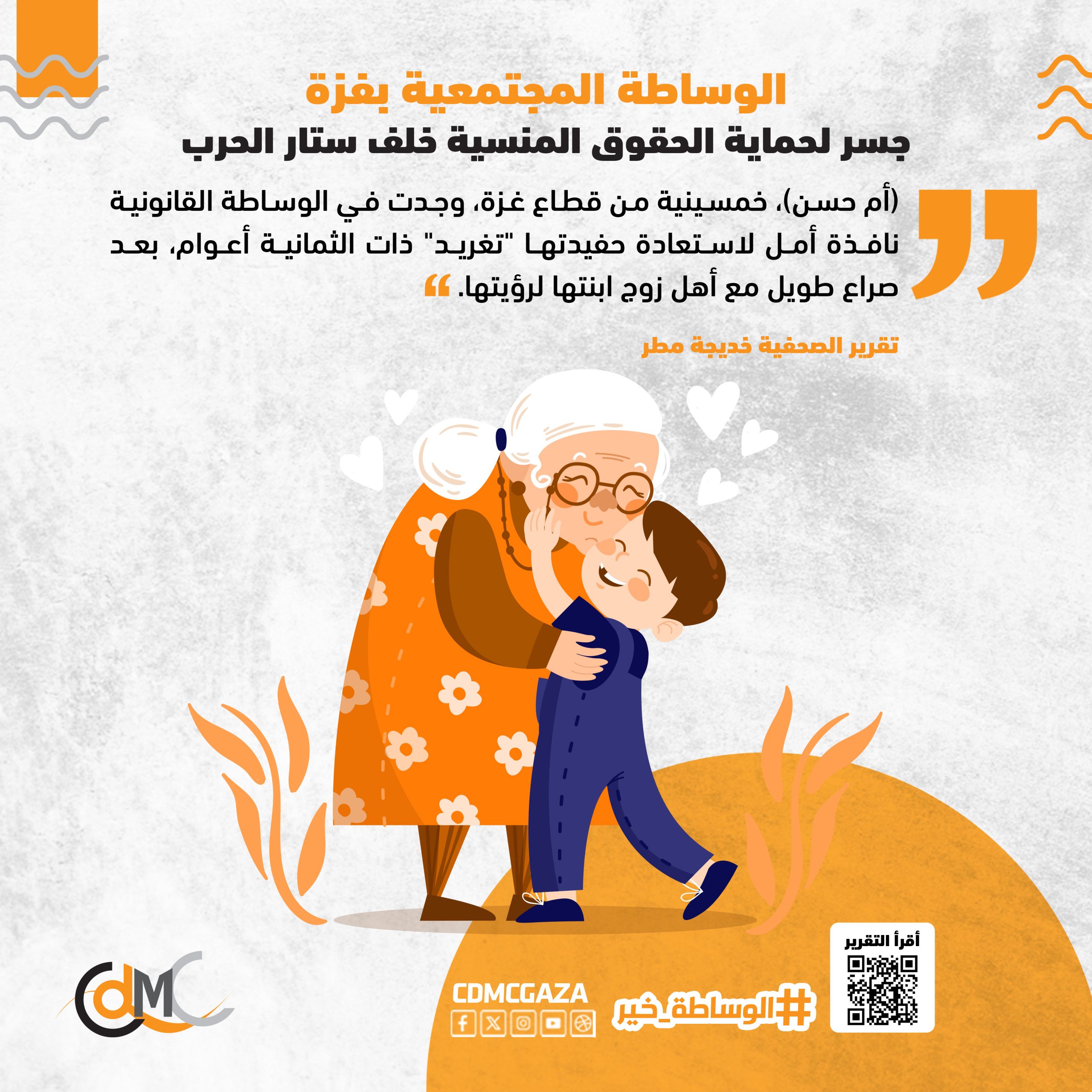(أم حسن)، خمسينية من قطاع غزة، وجدت في الوساطة القانونية نافذة أمل لاستعادة حفيدتها “تغريد” ذات الثمانية أعوام، بعد صراع طويل مع أهل زوج ابنتها لرؤيتها. تقول: “حُرمت من رؤية حفيدتي لسبعة أشهر، وواجهت رفضًا قاطعًا من أهل والدها. لجأت إلى مركز الوساطة المجتمعية عبر ‘الجمعية الوطنية للديمقراطية والقانون’، والتي بادرت بالتدخل لحل النزاع ومنحي حقي في المشاهدة”.