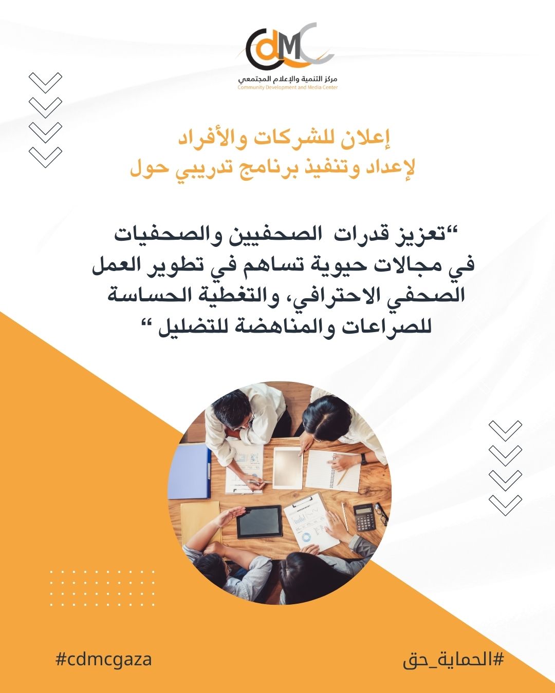 يسعى مركز التنمية والاعلام المجتمعي لتطوير العمل الصحفي من خلال منح فرصة لعدد من الصحفيين و الصحفيات و مطوري ومطورات الويب لتعلم تقنيات و أدوات أساسية لدعم تطوير الصحافة المهنية المسؤولة والتغطية الحساسة للصراعات والمكافحة للأخبار المضللة ، وعليه يطلق المركز برامج تدريبية مكثفة ومتخصصة من أجل إعداد وتطوير وتقديم مواد تدريبية متخصصة، حيث سيتم تنفيذ دورة تدريبية ل 40 صحفي و صحفية، موزعين على مجموعتين بواقع 20 مشاركاً في كل مجموعة، وذلك في موقعين مختلفين ضمن قطاع غزة (مدينة غزة -المحافظة الوسطي)، بالإضافة الى تنفيذ دورة تدريبية ل 20 مطور ومطورة ويب ضمن مجموعة واحدة في مدينة غزة.