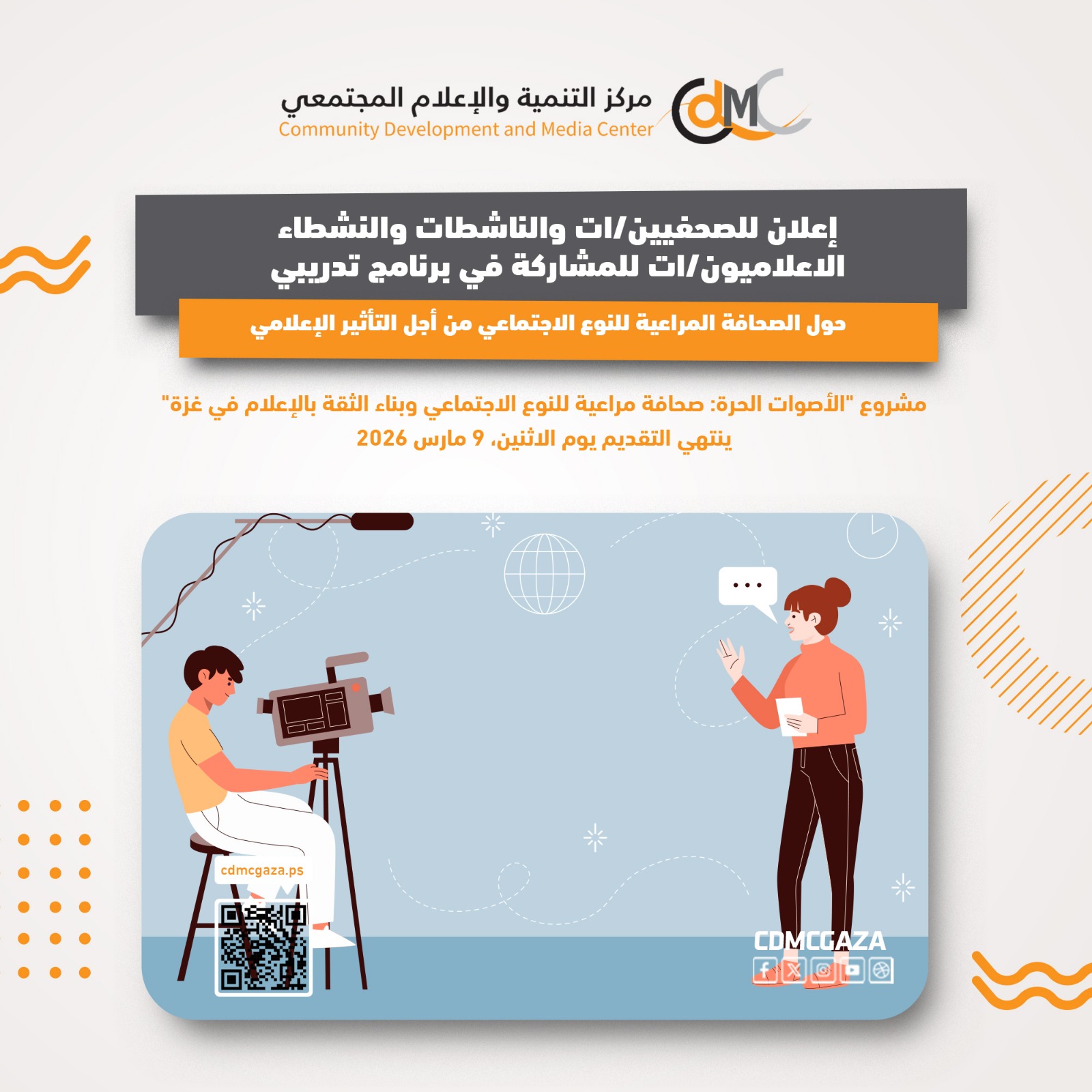 يعلن مركز التنمية والإعلام المجتمعي (CDMC) للصحفيين/ات عن فتح باب التسجيل للمشاركة في برنامج تدريبي متخصص، وذلك ضمن مشروع: “الاصوات الحرة ” صحافة مراعية للنوع الاجتماعي وبناء الثقة بالإعلام في غزة”