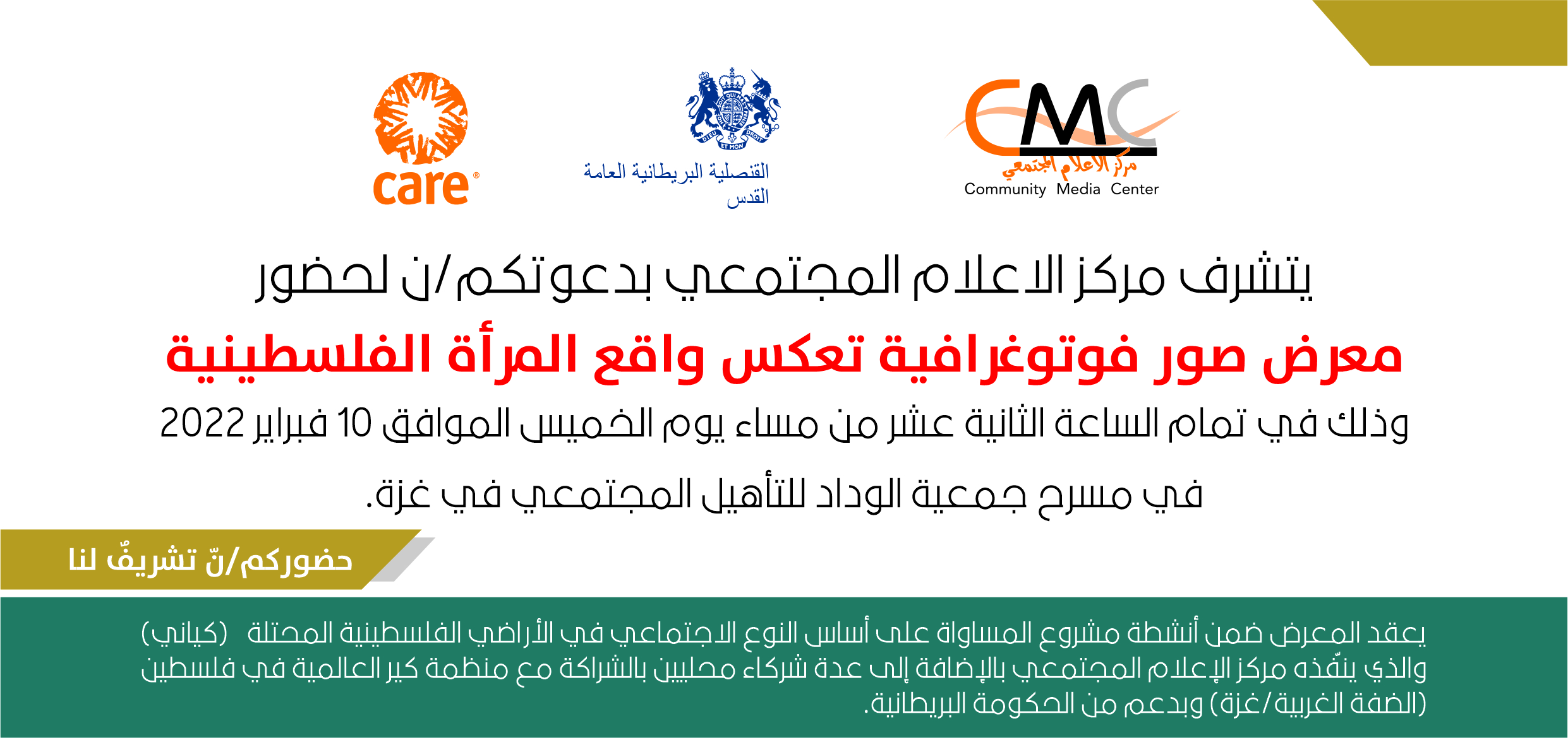 يتشرف مركز الإعلام المجتمعي – غزة بدعوتكم/ن لحضور معرض صور فوتوغرافية تعكس واقع المرأة الفلسطينية
