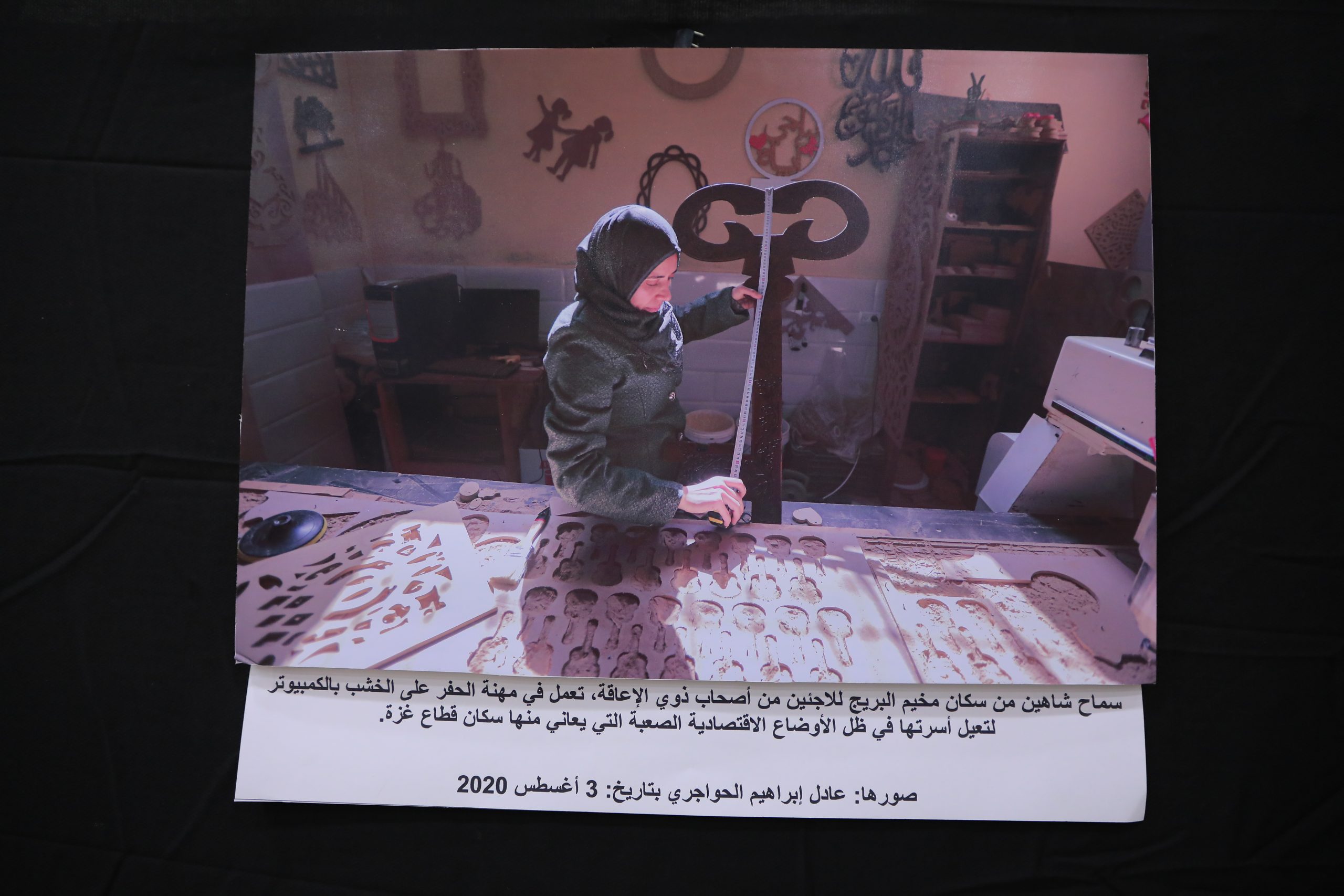 سماح شاهين سيدة من ذوات الإعاقة تسكن في مخيم البريج للاجئين، وتعمل في مهنة الحفر على الخشب بالكمبيوتر، لتُعيل أسرتها في ظل الأوضاع الاقتصادية الصعبة التي يعاني منها سكان قطاع غزة