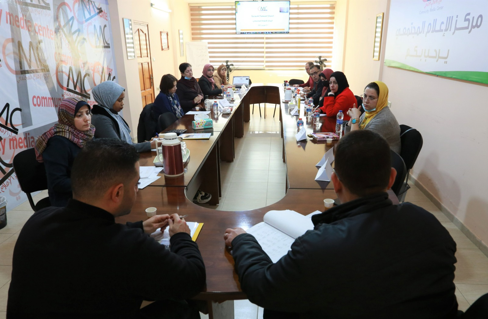 جرى الاجتماع في مقر CMC، مع الالتزام بكافة إجراءات السلامة المتبعة للوقاية من فايروس كوفيد-19، وبحضور إدارة مركز الإعلام المجتمعي وغالبية أعضاء الجمعية العمومية وجاهياً وآخرين عبر تطبيق (zoom)، وممثلين عن وزارة الاقتصاد الوطني الفلسطيني.