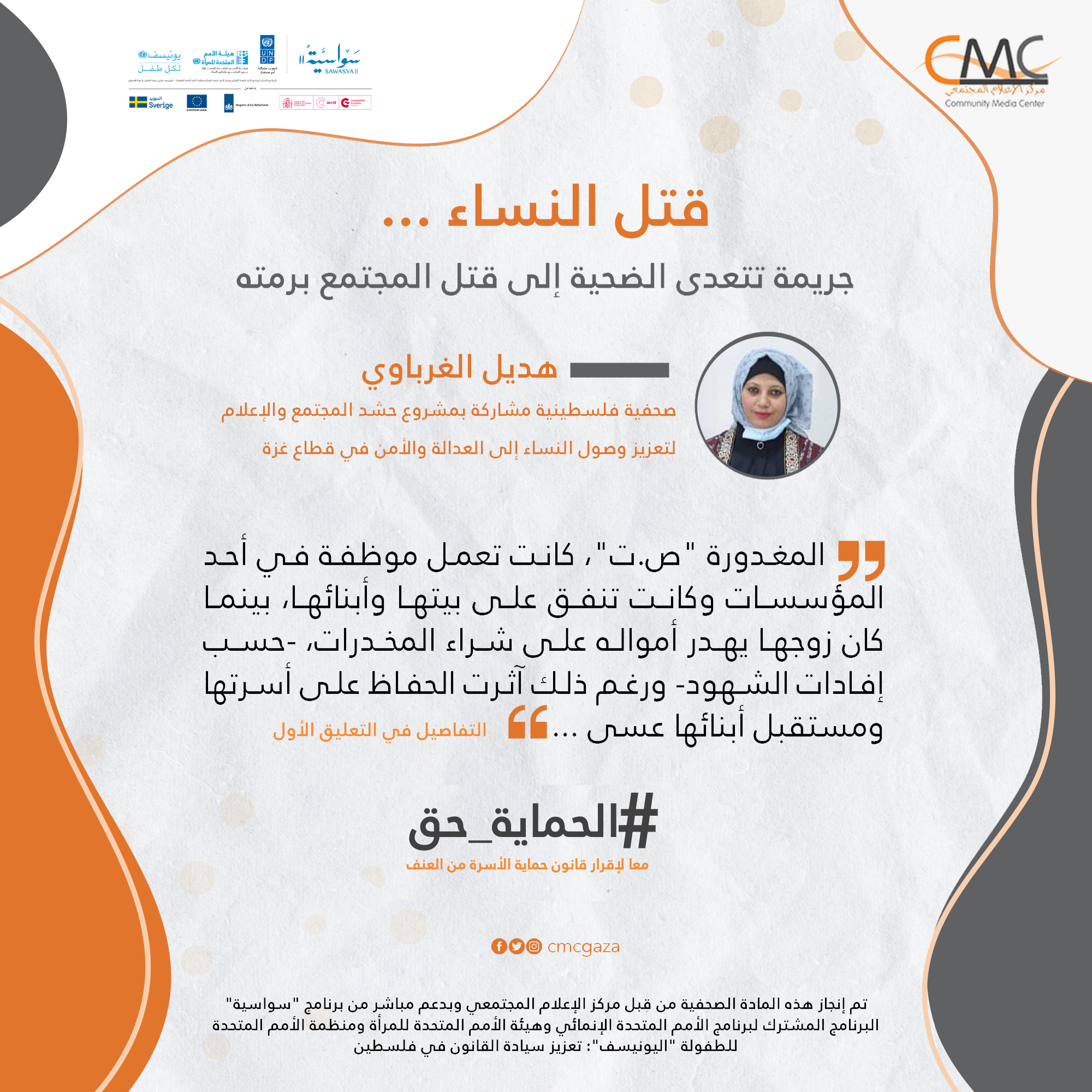 تم إنجاز هذه المادة الصحفية من قبل مركز الإعلام المجتمعي، وبدعم مباشر من برنامج “سواسية” البرنامج المشترك لبرنامج الأمم المتحدة الإنمائي وهيئة الأمم المتحدة للمرأة ومنظمة الأمم المتحدة للطفولة “اليونيسيف”: تعزيز سيادة قانون في فلسطين.