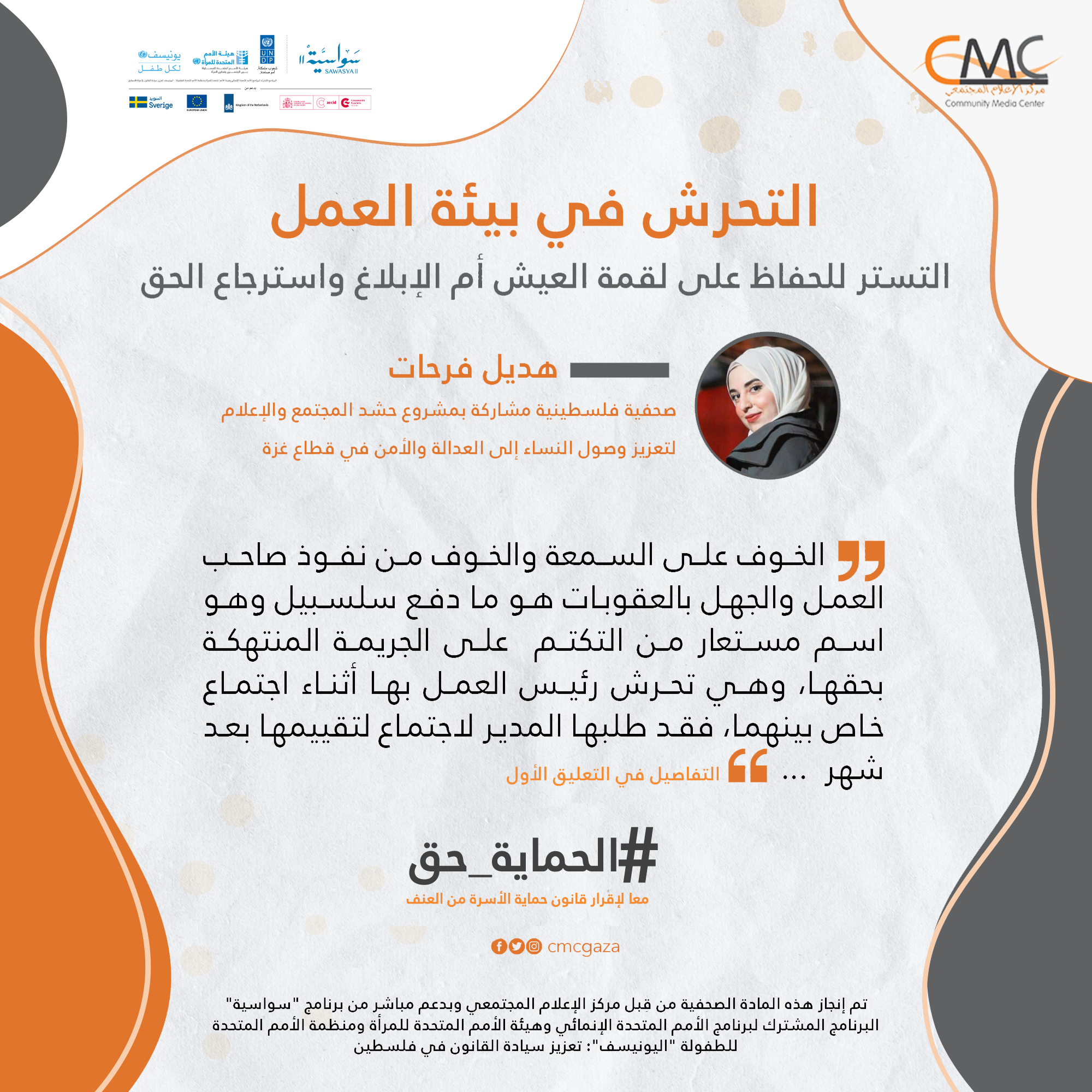 وأشارت الدكتورة آيات أبو جياب، أخصائية اجتماعية ومُعالجة أسرية، إلى أن ما يميز التحرش في بيئة العمل عن التحرش في الأماكن العامة وغيرها، بأن التحرش يأتي من أشخاص متعلمين ومثقفين وذوي مكانة ونفوذ، مما قد يزرع الرهبة في نفوس النساء والخوف من الإبلاغ أو الدفاع عن النفس، فتُجبر النساء على السكوت، وفي بعض الحالات الإنكار أصلاً بأنه تم التحرش بها خوفاً من النفوذ والسلطة أو خوفاً من قطع لقمة العيش.