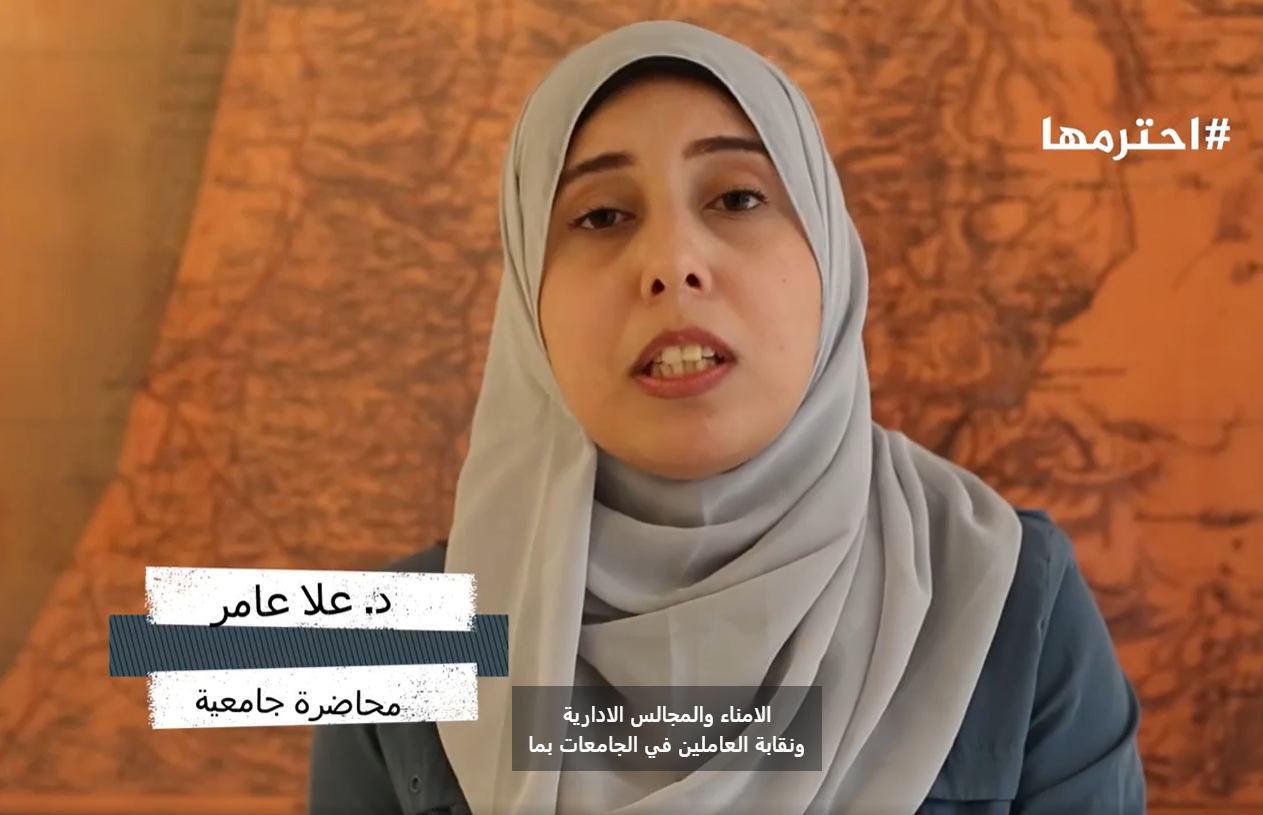 د. علا عامر تتحدث عن ضرورة زيادة نسبة تمثيل الأكاديميات في مجلس الأمناء والمجالس الإدارية ونقابة العاملين في الجامعات الفلسطينية، بما يضمن تواجدهن في مراكز صنع القرار وحصولهن على حقوقهن.