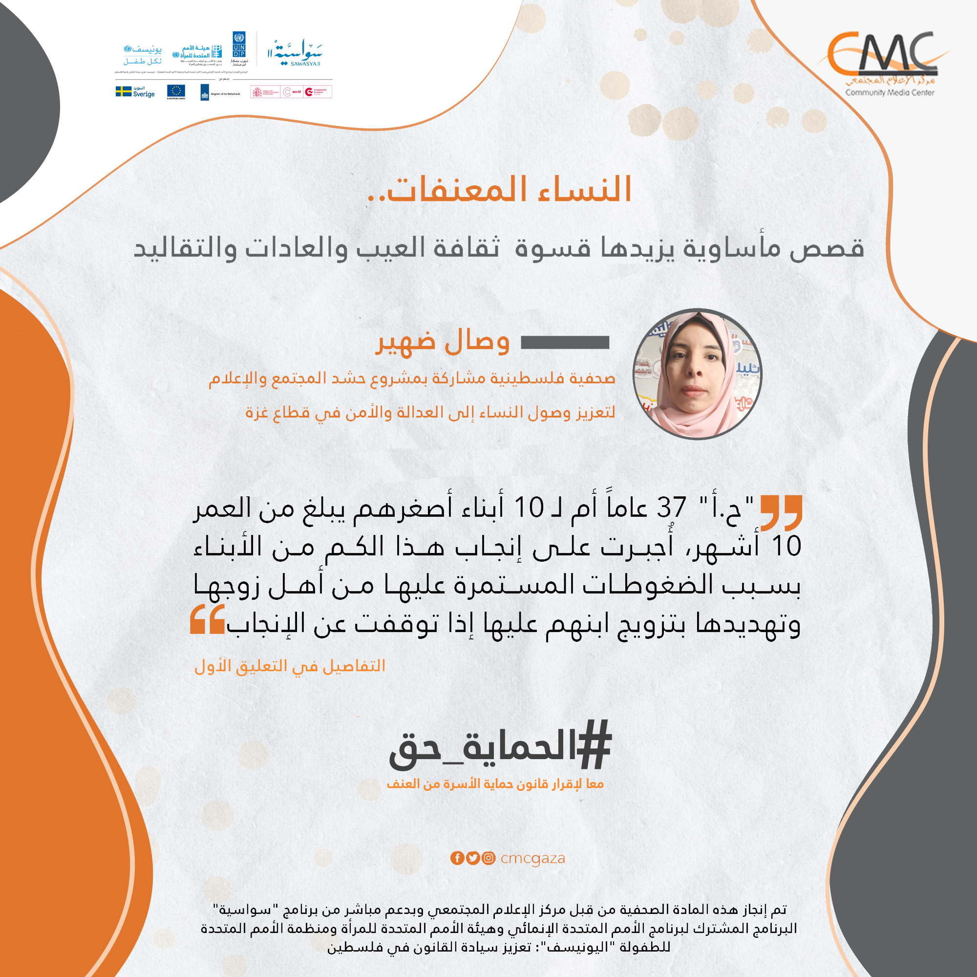 “ح.أ” 37 عاماً أم لـ 10 أبناء أصغرهم يبلغ من العمر 10 أشهر، أُجبرت على إنجاب هذا الكم من الأبناء بسبب الضغوطات المستمرة عليها من أهل زوجها وتهديدها بتزويج ابنهم عليها إذا توقفت عن الإنجاب.