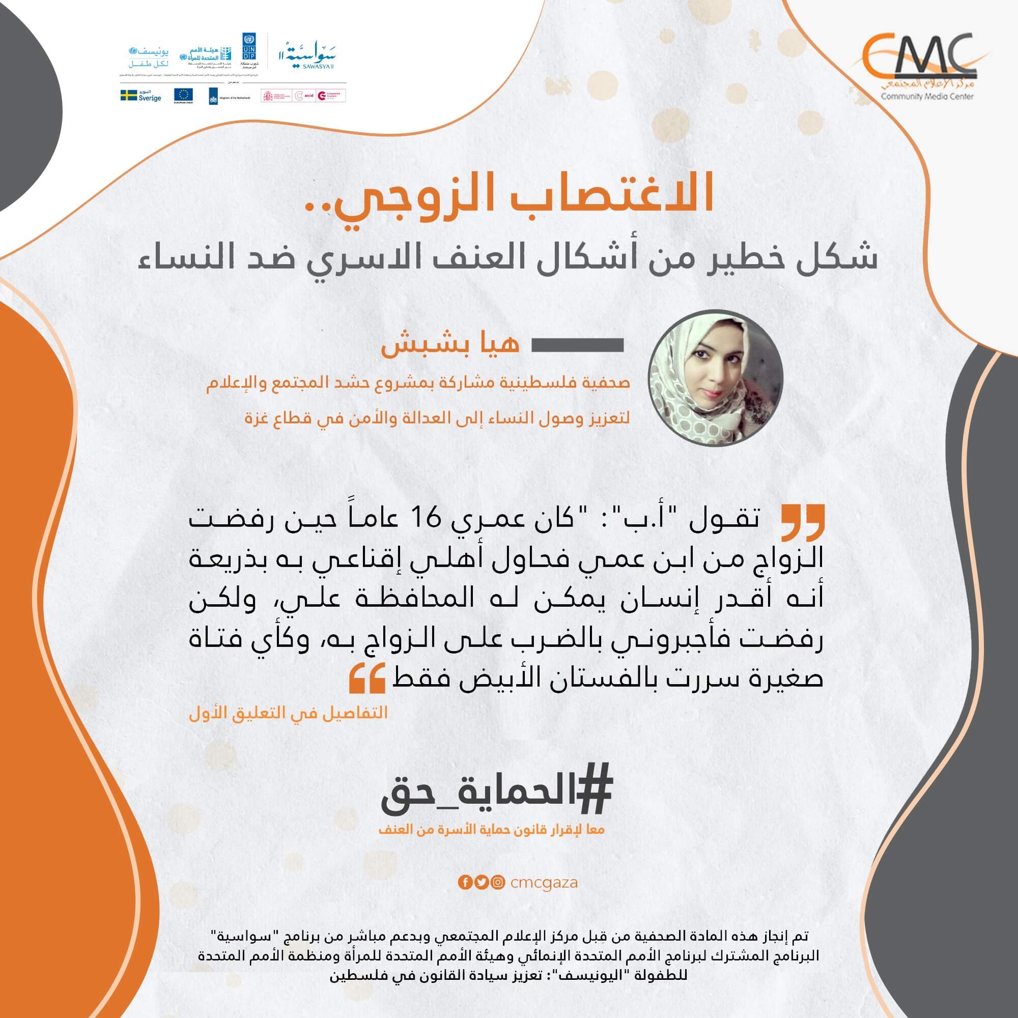 تم إنجاز هذه المادة الصحفية من قبل مركز الإعلام المجتمعي، وبدعم مباشر من برنامج “سواسية” البرنامج المشترك لبرنامج الأمم المتحدة الإنمائي وهيئة الأمم المتحدة للمرأة ومنظمة الأمم المتحدة للطفولة “اليونيسيف”: تعزيز سيادة قانون في فلسطين.