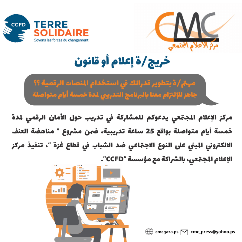 يدعوكم/ن مركز الإعلام المجتمعي للاستفادة من الفرصة المتاحة لكل من الشابات والشباب من خريجي/ات الإعلام والقانون في قطاع غزة والمهتمين/ات بتطوير قدراتهم، للالتحاق بتدريب حول الأمان الرقمي لمدة خمسة أيام تدريبية متواصلة بواقع 25 ساعة تدريبية، وذلك ضمن مشروع” مناهضة العنف الالكتروني المبني على النوع الاجتماعي ضد الشباب من كلا الجنسين في قطاع غزة “، الذي ينفذه مركز الإعلام المجتمعي بتمويل وشراكة من مؤسسة “CCFD”، حيث سيشارك/ستشارك المتدربين/ات بعد التدريب في تنفيذ ورش تعليمية لتثقيف الأقران الشباب من الجنسين حول الاستخدام الآمن لوسائل التواصل الاجتماعي في الفضاء الرقمي.